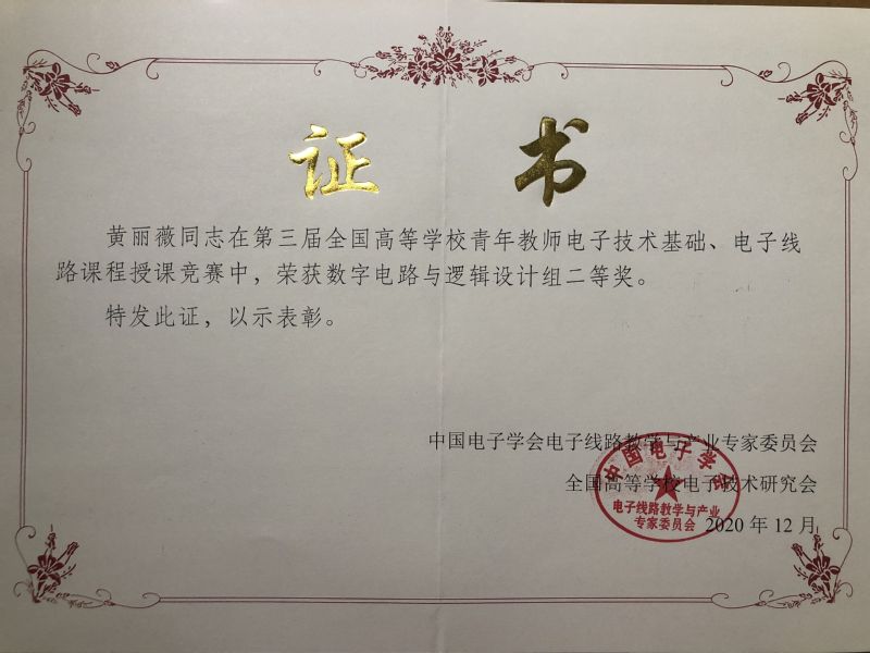 2020年12月3日-7日,由中国电子学会电子线路教学与产业专家委员会、全国高等公司电子技术研究会主办的第三届全国高校青年教师电子技术基础、电子线路课程授课竞赛总决赛在海南三亚举行,公司永利23411集团黄丽薇老师荣获二等奖。