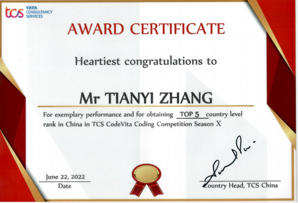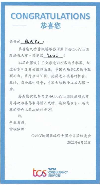 近日,第十届TCS CODEVITA编程大赛成绩揭晓,公司学子张天乙荣获中国赛区TOP5,世界排名第67名的优秀成绩,第10届大赛有来自87个国家的30多万名员工参加,这也是该比赛历史上竞争最激烈的比赛之一,该项赛事是由印度塔塔集团举办的国际编程大赛。